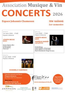 Concert organisé par l’association Musique & Vin : à l’issue du concert, partie terroir avec dégustation des vins d’une cave de Chamoson.