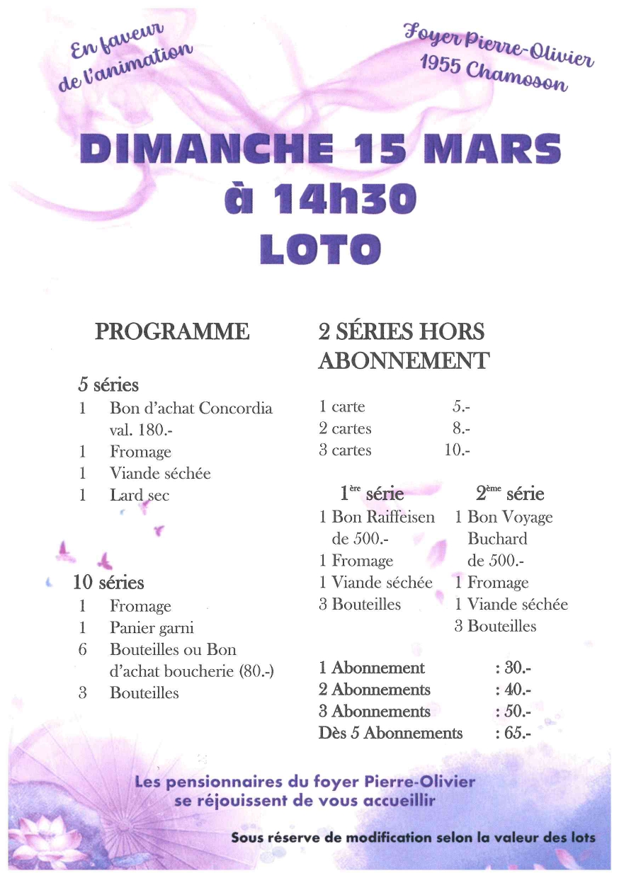 L’intégralité des bénéfices est attribuée à l’animation en faveur des pensionnaires qui se réjouissent de vous accueillir nombreux.